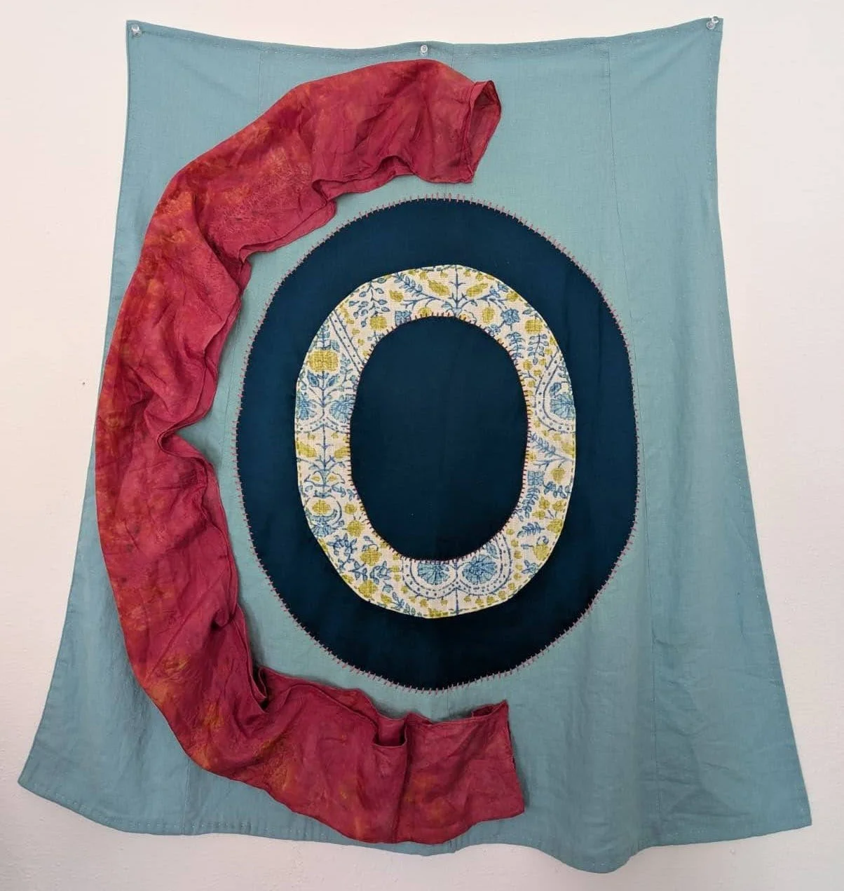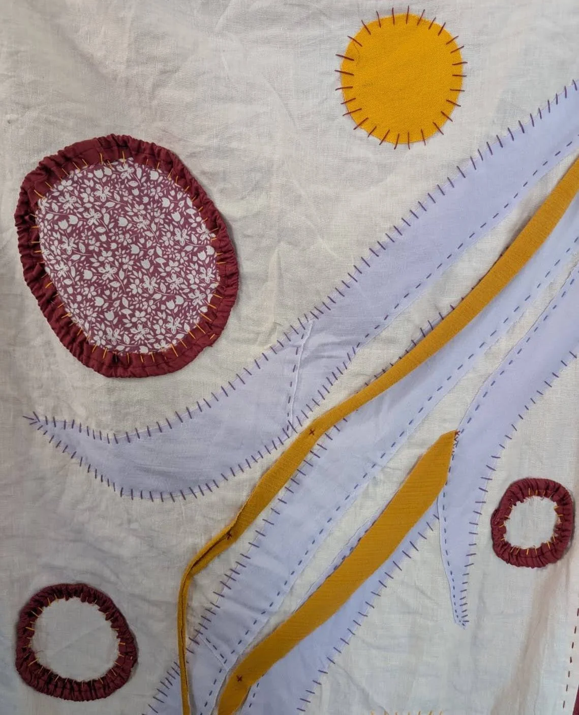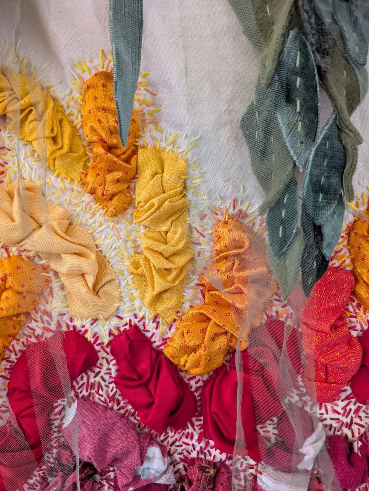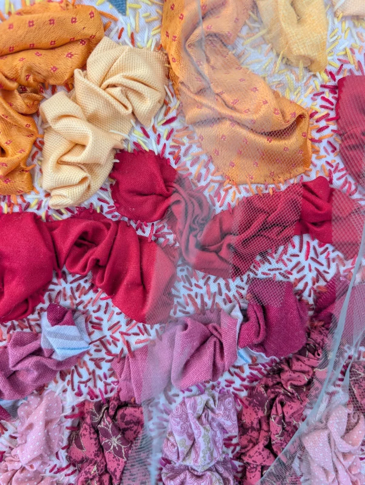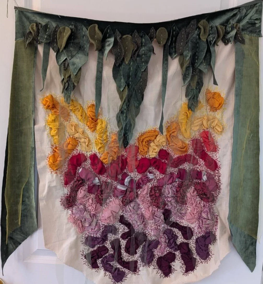 "Portal". Cotton and silk fabric hand-stitched with embroidery thread onto found skirt panel. 32 x 25 inches. "Portal". Cotton and silk fabric hand-stitched with embroidery thread onto found skirt panel. 32 x 25 inches. "Holding Light". Found fabrics hand-stitched with embroidery thread. 46 x 38 inches. "Holding Light". Found fabrics hand-stitched with embroidery thread. 46 x 38 inches. "Joy/The Sun". Hand-tatted lace, gauze, beads, and embroidery thread, on cotton fabric. 25 x 25 inches. "Joy/The Sun". Hand-tatted lace, gauze, beads, and embroidery thread, on cotton fabric. 25 x 25 inches. "Joy/The Sun". Hand-tatted lace, gauze, beads, and embroidery thread, on cotton fabric. 25 x 25 inches. "Dream Garden". Various fabrics, embroidery thread, tulle. 33 x 30 inches. "Dream Garden". Various fabrics, embroidery thread, tulle. 33 x 30 inches. "Dream Garden". Various fabrics, embroidery thread, tulle. 33 x 30 inches. "Dream Garden". Various fabrics, embroidery thread, tulle. 33 x 30 inches.