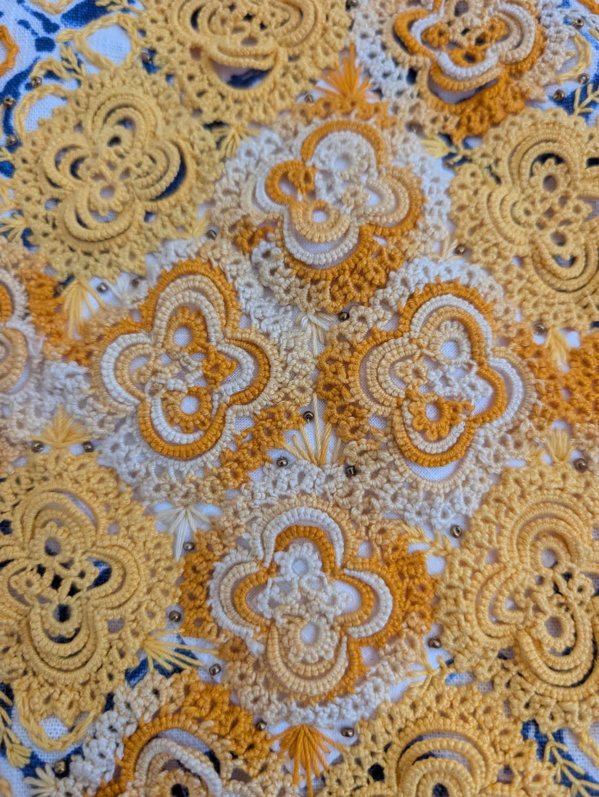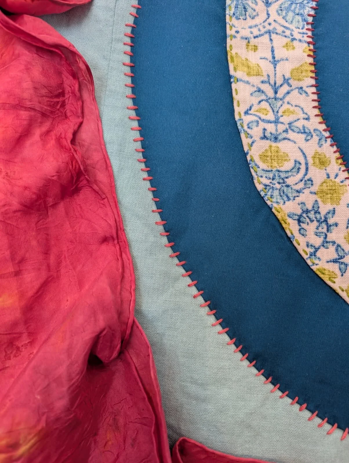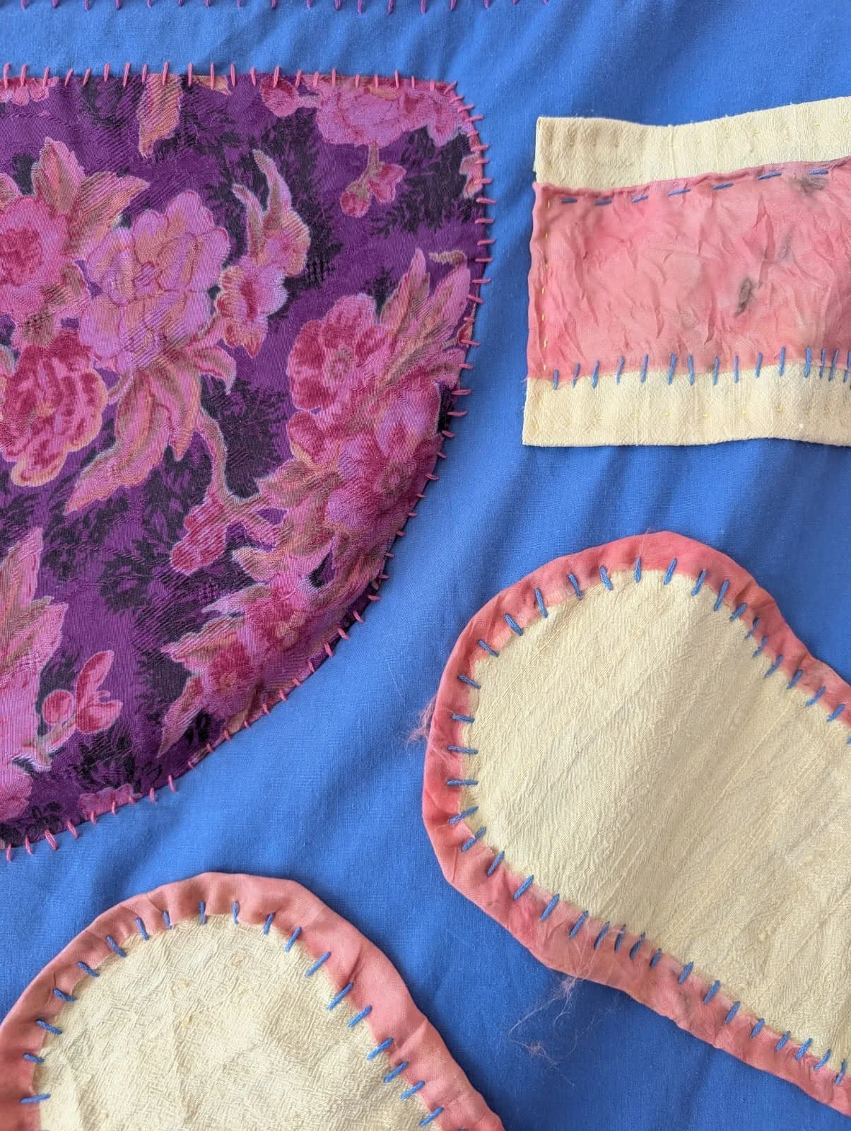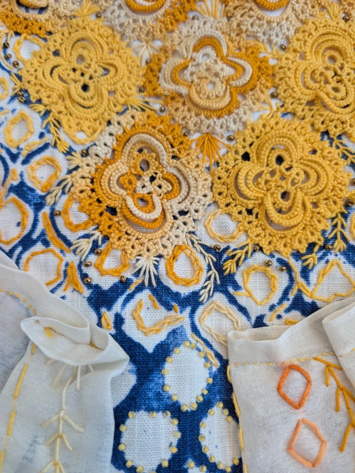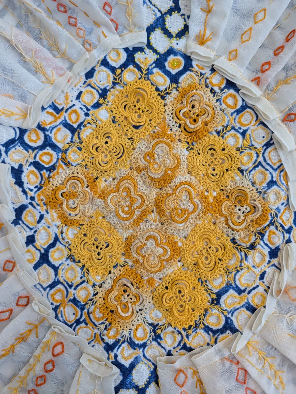 "Portal". Cotton and silk fabric hand-stitched with embroidery thread onto found skirt panel. 32 x 25 inches. "Portal". Cotton and silk fabric hand-stitched with embroidery thread onto found skirt panel. 32 x 25 inches. "Holding Light". Found fabrics hand-stitched with embroidery thread. 46 x 38 inches. "Holding Light". Found fabrics hand-stitched with embroidery thread. 46 x 38 inches. "Joy/The Sun". Hand-tatted lace, gauze, beads, and embroidery thread, on cotton fabric. 25 x 25 inches. "Joy/The Sun". Hand-tatted lace, gauze, beads, and embroidery thread, on cotton fabric. 25 x 25 inches. "Joy/The Sun". Hand-tatted lace, gauze, beads, and embroidery thread, on cotton fabric. 25 x 25 inches. "Dream Garden". Various fabrics, embroidery thread, tulle. 33 x 30 inches. "Dream Garden". Various fabrics, embroidery thread, tulle. 33 x 30 inches. "Dream Garden". Various fabrics, embroidery thread, tulle. 33 x 30 inches. "Dream Garden". Various fabrics, embroidery thread, tulle. 33 x 30 inches.